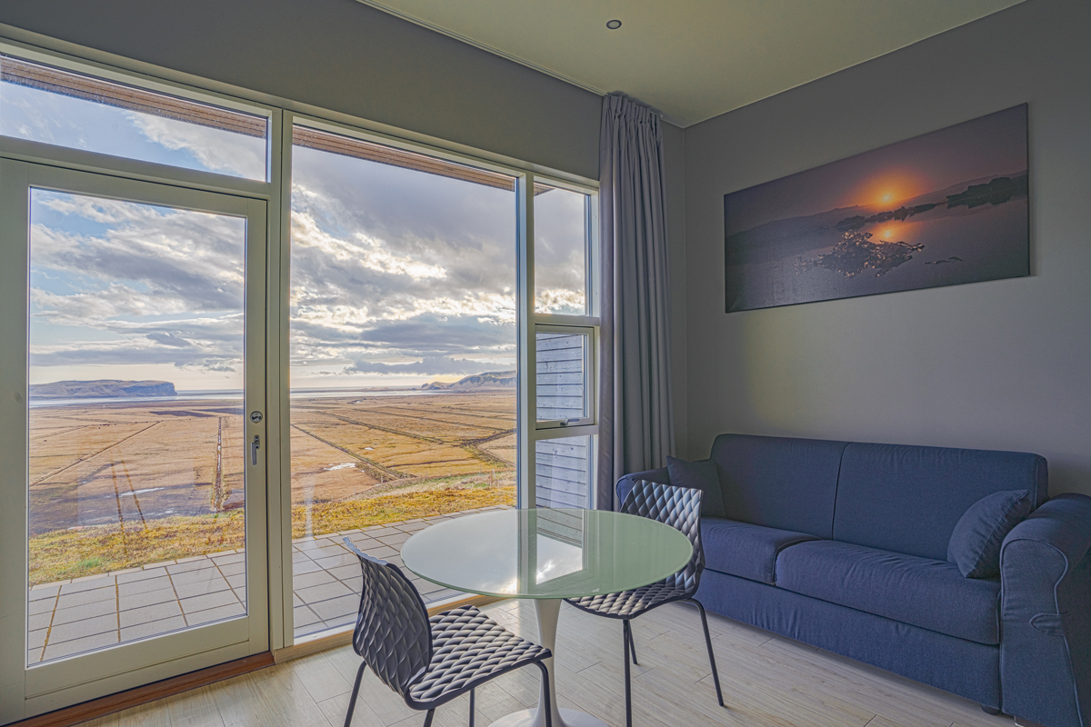 Black Beach Suites offer spacious suites with kitchenettes, private terraces, and sweeping views of the ocean and surrounding mountains. Guests can absolutely immerse themselves in the raw beauty of the Katla UNESCO Global Geopark while enjoying a peaceful, nature-focused stay.