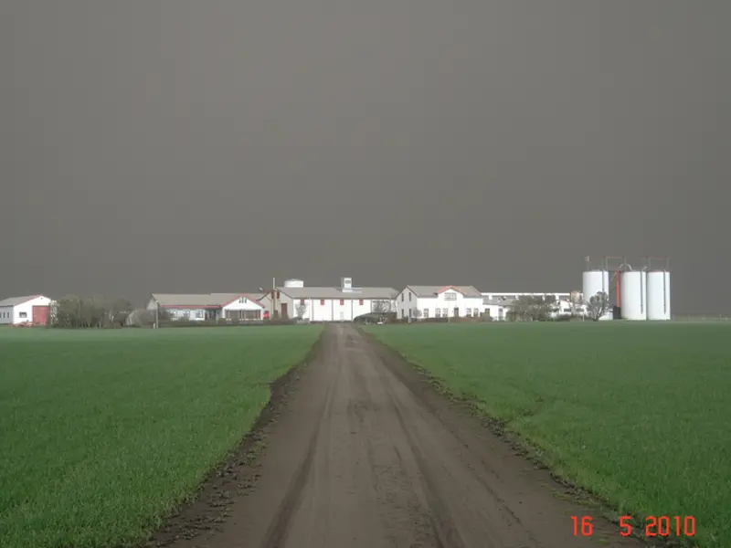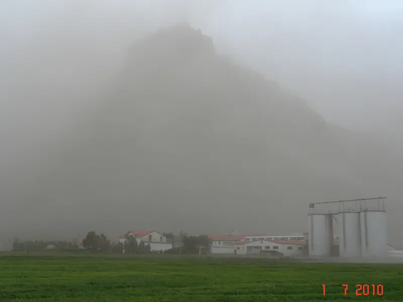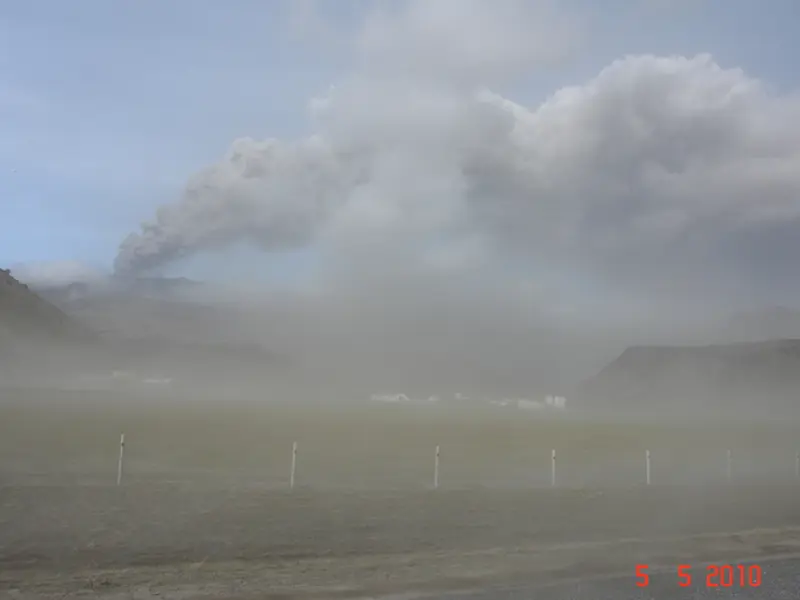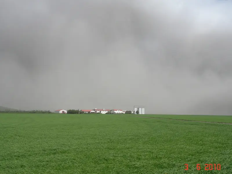 High amount of tephra, mostly ash, fell in the vicinity of Eyjafjallajökull volcano during the eruption and covered the landscape, including Þorvaldseyri farm and its vicinity. Most of the ash, or about 85% of it, was produced during phase I and III of the eruption, with phase I creating the most amount of very fine ash. In total, the amount of tephra produced in the eruption was 270±70*106 m3, of which 140±20*106 m3 (bulk volume, density 1400 kg 0-3) fell in Iceland and further 25±10×106 m3 of tephra were transported out of the craters with meltwater. The tephra was thickest close to the eruption sites, up to 30 meter thick, and got gradually thinner further away from the volcano. Near Þorvaldseyri farm the ash cover was about 2,5 cm thick on flat area, but where the ash would accumulate it could be much thicker. The thickness of the ash is very important as it can suffocate underlying vegetation. If the ash is thinner than 2,5 cm, the underlying vegetation is normally able to grow through the ash and the ash quickly gets absorbed into the soil. If the ash is however thicker than 2,5 cm, the vegetation has a harder time getting through it and can easily be suffocated by it. If ash thickness goes above 15 cm, all low-lying vegetation is suffocated, and it can take a few decades for both the soil and the vegetation cover to recuperate. Luckily, the ash did not cause widespread damage on vegetated land, both due to action taken by farmers to try to decrease the thickness of ash there, but also due to winds and rain. In the end, especially in the years following the eruption, the ash had a positive impact on vegetation in many areas due to the amount of nutrition that dissolve from the ash.