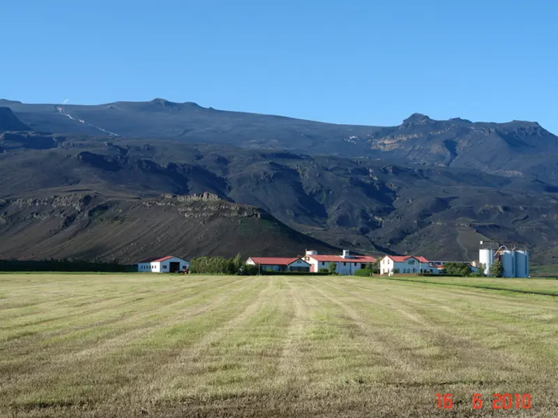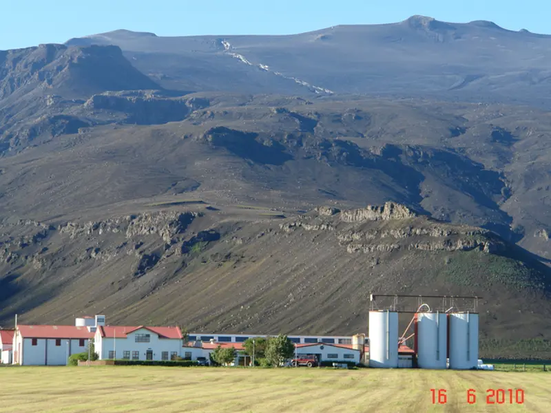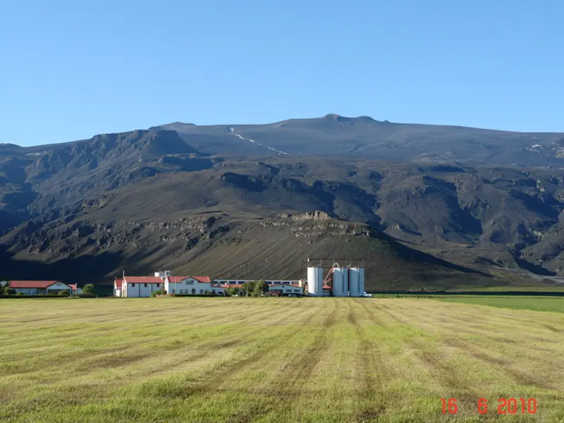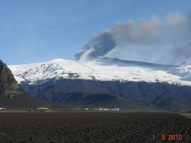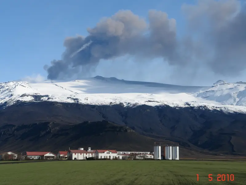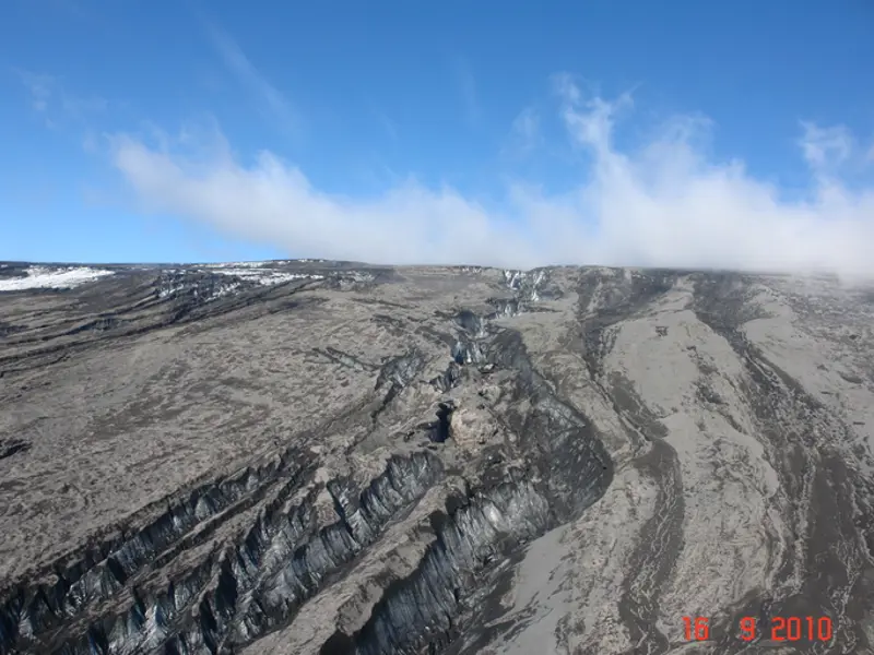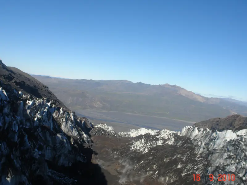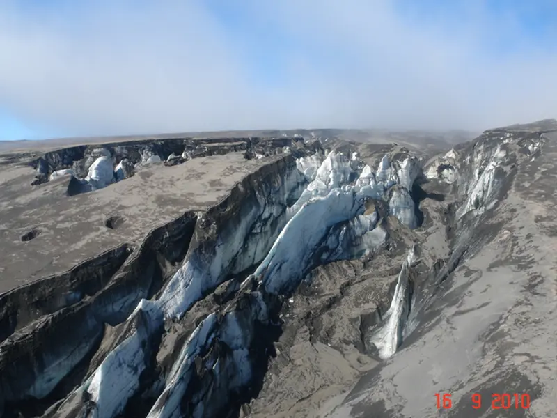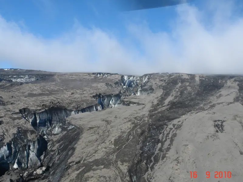 One outburst flood, however, came down the southern side of the volcano and was caused by the short-lived fissure south of the caldera. The flood came down into the valley above Þorvaldseyri farm and drained into the river of Svaðbælisá on the morning of the 14th of April. The flood was small but did cause damage to agricultural land of the farms of Þorvaldseyri and Önundarhorn, along with damaging a flood wall, roads and for a time threaten the small bridge over the river on road 1. The flood carved a 3 km long pathway through the glacier on its way down, which can be seen in the photo. The flood caused erosion in canyons on the mountainside of Eyjafjallajökull and considerable deposition of large rocks and other debris in the valley above Þorvaldseyri farm. Due to the flood, it was decided to build flood walls along Svaðbælisá river to try to contain future flooding, something that would prove to be invaluable later.