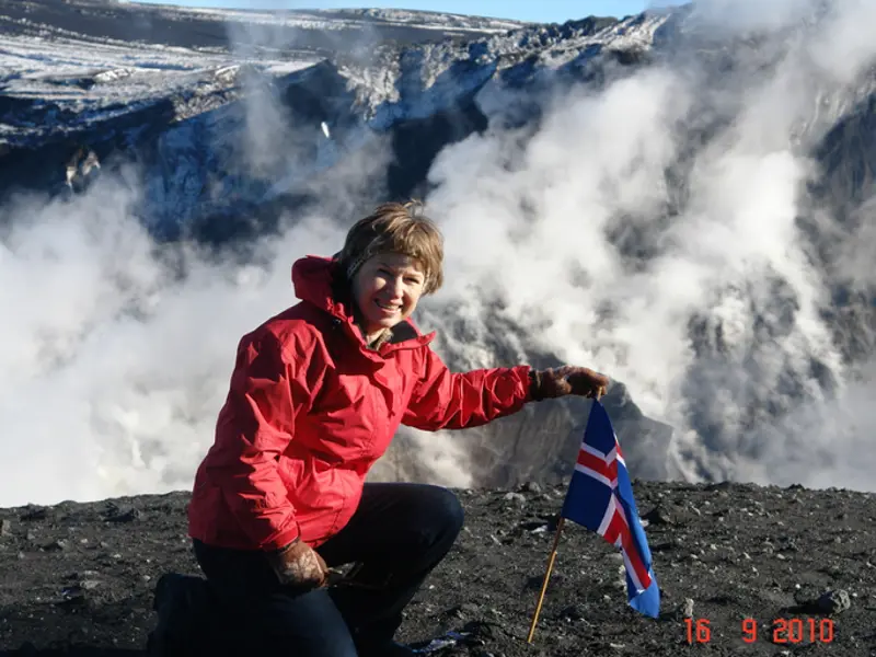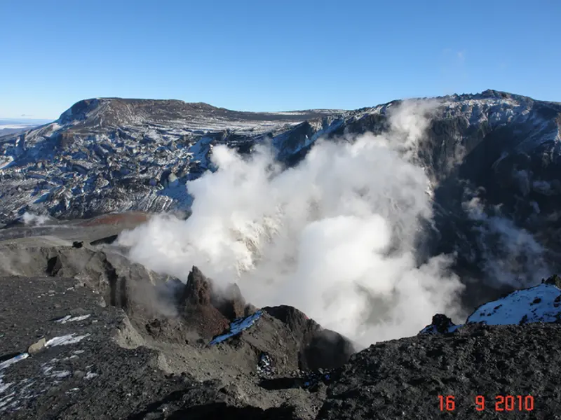 The main crater in Eyjafjallajökull a few months after the eruption with steam still rising from the eruption site and the broken glacier all around. The photograph was taken on September 16, 2010, by Guðný Valberg, a farmer on Þorvaldseyri farm, during a helicopter flight over the eruption site. Four months had passed since the eruption ended, but the end of the eruption was not declared until October 28.