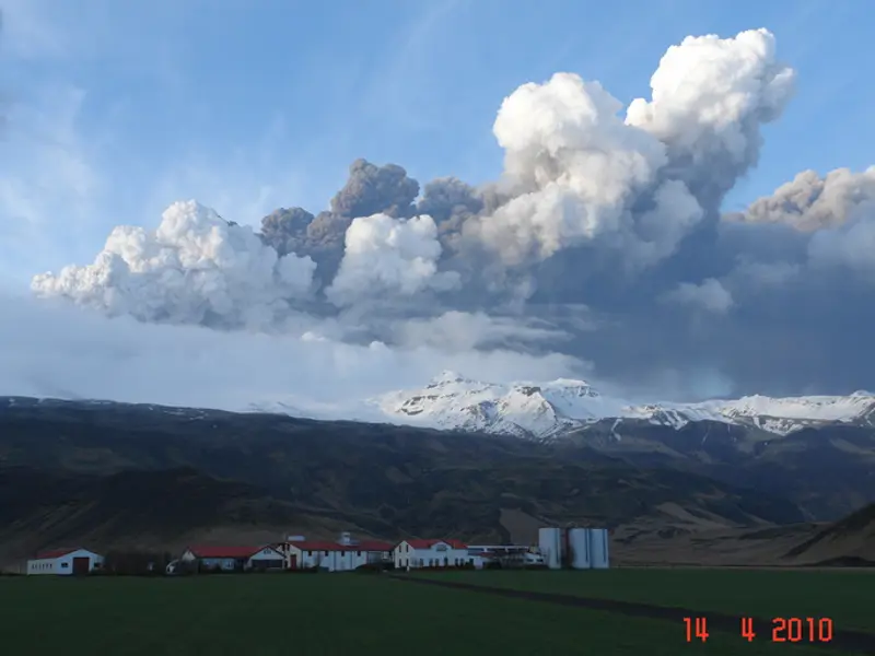 The eruption in Eyjafjallajökull itself began on April 14th, 2010, when fissures opened within the caldera. The eruption site was under the glacier, so a phreatomagmatic eruption began, which is an explosive eruption, which caused heavy tephra production and a high rising eruption plume. At the onset of the eruption, Eyjafjallajökull was covered by dense clouds and fog, but on the afternoon of the 14th, a small opening in the clouds showed the eruption column for the first time. The photo shown here was taken by Ólafur Eggertsson, farmer at Þorvaldseyri, on the afternoon of the 14th and is the first photograph taken of the eruption from the ground. The eruption would last from 14th of April until the 22nd of May, or for 39 days, and is divided into four phases depending on the type of activity the eruption had.
