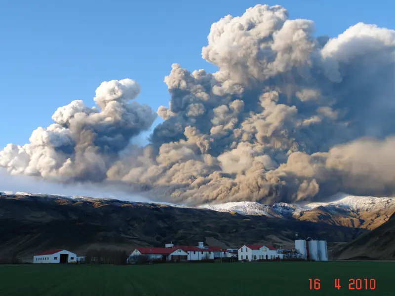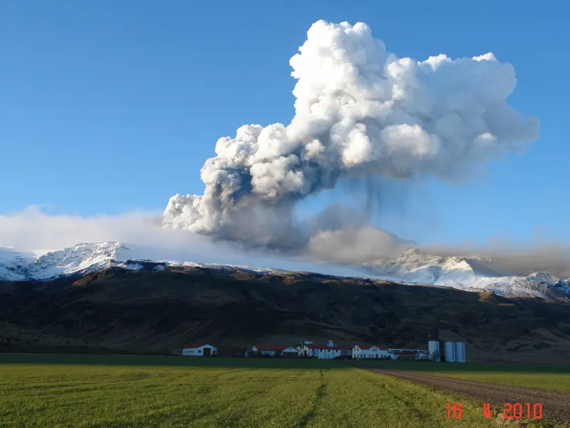 Although the eruption of Eyjafjallajökull was a medium-size eruption with the volcanic plume rarely rising above 7 km, it was unusual in its duration and amount of ash dispersed to the south and southeast of Iceland. During the first two days of the eruption, the wind forced the plume downwards. That, coupled with a relatively weak gas thrust yet high amount of tephra in the plume, caused the plume to be rather low above the eruption site and a “close to ground” transport of ash occurred. The photo was taken on the 16th of April and shows the low-lying plume and the “close to ground” transport.