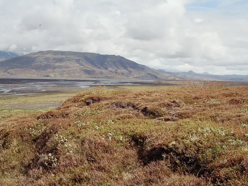The view from the top of Thórólfsfell is breathtaking with a view of three glaciers- Mýrdalsjökull, Tindfjallajökull, and Eyjafjallajökull. From Fljótsdalur, a hike can be taken to the top of Thórólfsfell. 4×4 cars can cross the Thórólfsá River, but smaller cars must be left at the public car-park at the signboard. Pedestrians can cross the river using the footbridge. (Note- this is the only place to cross the river without having to wade across.) Follow the river, always keeping it to your left, and cross the boundary fence by the wooden stile.(steps) Then follow the sheep path by the gorge which leads to an embankment of rough gravel, and from there take the grassy slopes to the summit which is marked by a cairn. It is worth walking to the eastern edge to get better views into the interior. The round trip hike takes approximately 4+ hours.
