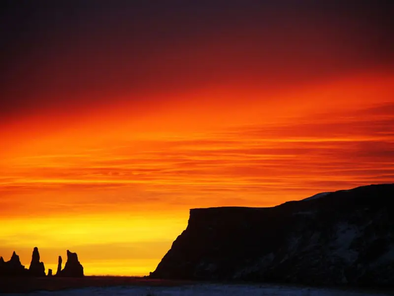 Lava intrusions are common and are created when lava forces its way into the tuff during an eruption. If the tuff prevents water from coming into contact with the lava during an intrusion, the lava often forms basalt columns as it slowly cools and cracks, often creating hexagonally shaped columns as the surface area decreases. These remarkable columns always stand perpendicularly to the cooling surface and the direction of the columns can often vary due to multiple cooling surfaces. Powerful erosional forces, especially in the form of waves from the sea have created many beautiful formations and have contributed to the shape of Mt. Reynisfjall.