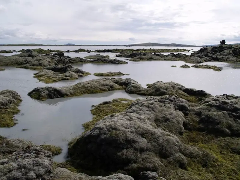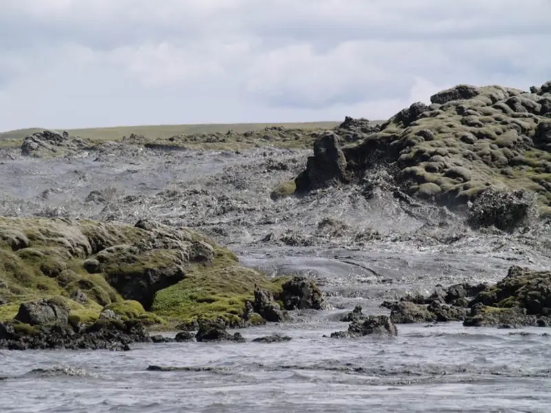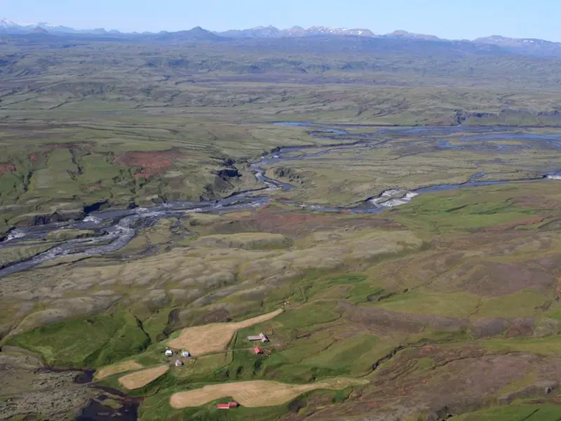 Skaftá River is one of the large glacial rivers present in the region. It is particularly voluminous and long. Its length from source to estuary is about 115 kilometres. Skaftá is a mixed glacial and spring-fed river. The main sources of the glacial meltwater are in Skaftárjökull at Vatnajökull Glacier and spring water from Lake Langasjór is rapidly added into the meltwater. In summer, Skaftá River’s colour is coloured by mud from glacial meltwater, whereas in winter it is most often crystal clear. The uppermost farmstead by Skaftá River is called Skaftárdalur; where the nearby river basin is about 1400 km² with and an average flow of about um 115 m³/s. Above Skaftárdalur a number of rivers and streams run into the Skaftá River, with the most prominent being Grjótá, Hellisá, and Southern and Northern Ófæra, all of which are spring creeks. Below Skaftárdalur, the Skaftá River expands and diverges into two main branches. To the west, there is the Eldvatn River (also called Ása-Eldvatn) which runs west along the Skaftártunga area and over into the Kúðafljót River. To the east, the Skaftá River itself runs, which bends east along the Síða hillside, by the town of Kirkjubæjarklaustur and finally into the ocean around the estuary Veiðiós. A portion of the Eldvatn and Skaftá rivers branches around grooved lava are called Ásakvíslar on the one hand and Árkvíslar on the other; They have, however, changed a bit the last years due to road construction. A portion of the water that runs into the lava disppears into it and emerges as spring water at the southern edge of Skaftáreldahraun Lava Field, at Eldvatn in Meðalland among other places.