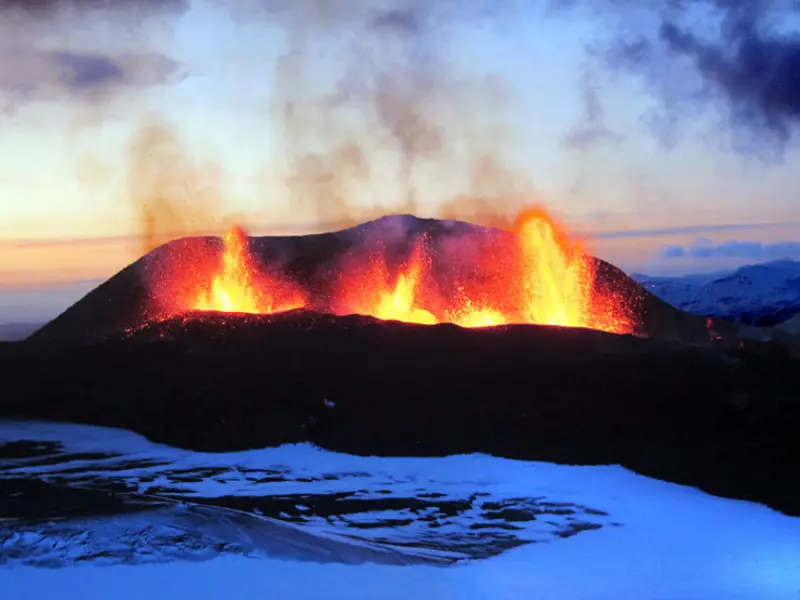 The 2010 eruption of Eyjafjallajökull started on the 20th of March, in an area called Fimmvörðuháls west of the caldera of Eyjafjallajökull. A 300 meter long volcanic fissure opened, and lava started flowing from 15 vents. A day later, on the 31st of March, another fissure opened close to the first one and both fissures were active at the same time. The activity on the fissures quickly started being concentrated, with main two craters forming, one on each fissure. The activity on the two fissures continued until the 8th of April, when no activity was observed from the first fissure anymore. On the 12th of April, the second fissure had also stopped erupting and this part of the eruption came to an end. This part of the eruption was an effusive eruption, meaning that lava flowed freely from the eruption site and there was limited explosive activity and tephra production. The eruption was a typical basaltic fissure eruption with lava fountains reaching up to 180 meters in height from the eruptive fissures. As the eruption continued, a lava field started to form on Fimmvörðuháls and at one point, lava started to cascade down into Hrunargil gorge, creating a spectacular and up to 50 m high lava falls in the process. The lava that was erupted was alkali olivine basalt (47,7% SiO2) and the average discharge rate over the 23 days of the eruption was 10 m3/s. The eruption was therefore a small eruption with a low discharge rate. The lava field that was formed from the eruption covers 1,3 km2 with a volume of 0,02 km3, and is called Goðahraun, meaning the lava field of the Gods). Two volcanic cones were formed, one from each fissure, during the eruption. The cone from the first fissure was named Magni and is a scoria cone, while the other one is a spatter cone and was named Móði.